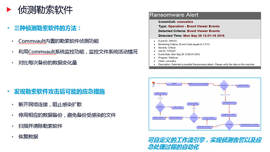 第一:先发制“人”:Commvault软件内置勒索软件检测告警,利用人工智能技术和“蜜罐”技术,主动侦测对文件的异常访问行为,提供客户端系统监控功能。通过Commvault独有的可自动触发的工作流引擎,帮助企业早期发现勒索软件攻击并自动执行相应应急措施。