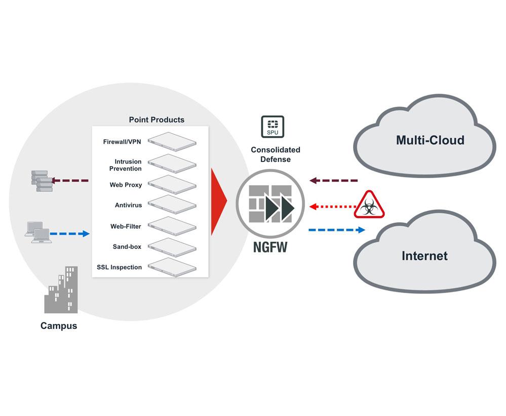 FortiGate NGFW有多种不同型号, 满足用户从入门级硬件设备到超高端设备的部署选择,藉以满足苛刻的网络环境与威胁防护性能要求。 无论是企业园区、数据中心,亦或是内网部署,FortiGate均可以无缝融入用户的网络环境。