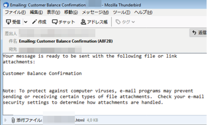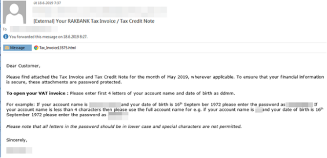 6月18日,研究人员截获的垃圾邮件主题大多具有诱惑性,欺骗用户点击,如“您的RAKBANK税务发票”、“免税额度”或者“确认函”。其附件同样是使用上述.html文件,带有恶意宏的Excel或者Word文档,最终目的是下载安装FlawedAmmyy RAT和Amadey。随后其会传送“EmailStealer”信息窃取程序,在受害者的机器中窃取邮件传输协议(SMTP)凭据和电子邮件地址。