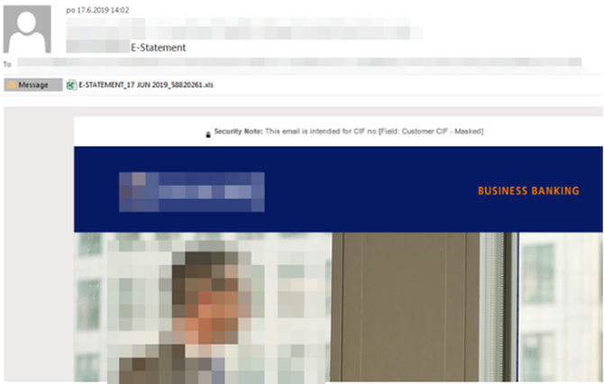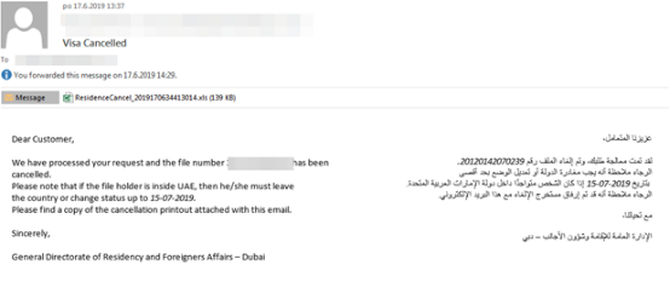 6月17日,亚信安全研究人员截获了大量针对亚洲银行发动的垃圾邮件攻击活动,这些邮件使用“阿联酋航空NBD电子声明”或者“签证取消”等主题诱骗用户点击邮件附件,邮件附件是嵌入恶意程序的Excel文件。运行后,其会下载ServHelper加载器。