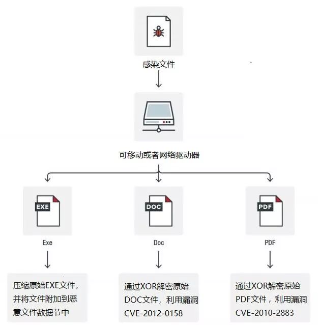 此行为是由于特殊模板在附加主机文件时利用了CVE-2010-2883漏洞。该漏洞可以在Adobe的CoolType.dll的strcat函数中找到,它是一个排版引擎。由于此函数不需要检查要注册的字体的长度,因此可能导致堆栈缓冲区溢出以执行其shellcode。最终其使用XOR解密原始PDF主机文件。此过程如下图所示: