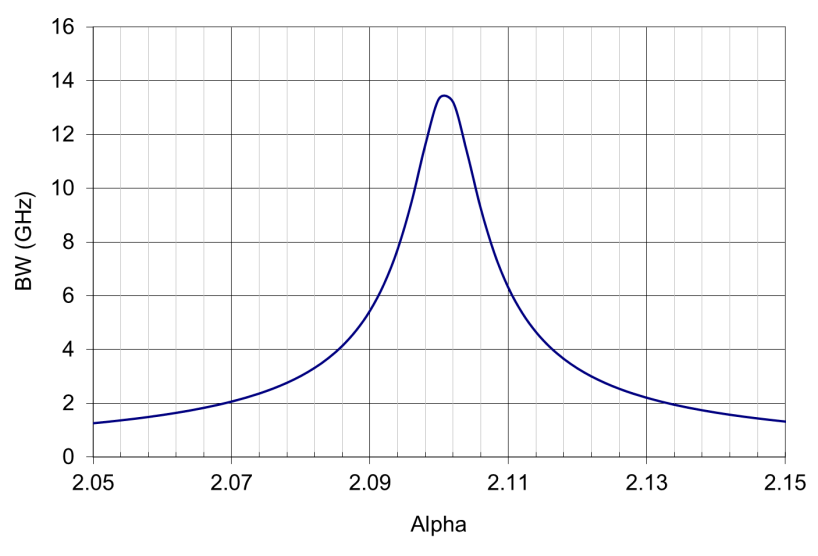 选择合适的值,多模光纤的模式带宽可以在一定波长范围内进行优化。图3为50 µm多模光纤在850 nm波长值变化1%时的带宽分布,光纤的值在最佳位置时,带宽值超过13 GHz.km。该图也反映出多模光纤的带宽对值非常敏感,如实现最大的带宽,需要对值(纤芯折射率)进行非常精细的控制,否则纤芯剖面在制造过程中的各种缺陷会影响多模光纤的实际带宽。