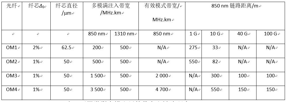 表1 不同类型多模光纤的带宽和链路距离