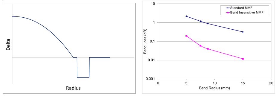 图5 弯曲不敏感多模光纤的折射率剖面 图6 标准和弯曲不敏感多模光纤的弯曲损耗对比