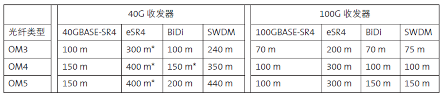 表2:不同光纤类型和收发器类型的传输距离(米)