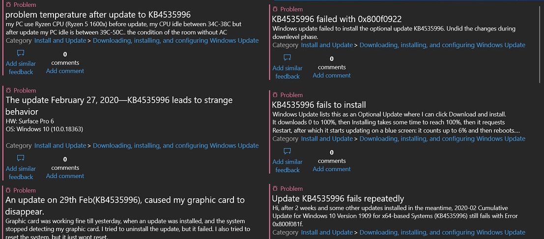 终于,微软现在承认了KB4535996的不完美,并承诺已在着手定位“病灶”,并计划3月中旬发布新补丁予以修复。