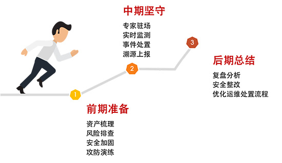一次完整的安全保障需要经历三个阶段:前期准备、中期坚守、后期总结。其中前期准备主要集中在人防工作,但是到了中期坚守时,人防的优势就不那么明显了,毕竟人不可能24小时不间断值守,其响应动作也没有专业防护设备来得快与准确,因此对待重保的重要阶段,中期坚守靠的就是技防。
