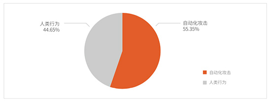 综合来看,Bots发起的请求占比已经超过网站访问总量的一半,达到55.35%,而对于某些提供公共信息查询的政务系统,Bots请求比例甚至超过80%。