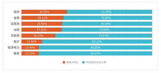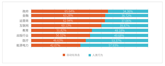 “互联网+政务服务”开放了大量数据查询服务,这些数据经过聚合之后可以成为具有极高价值的国家级大数据,因此吸引了黑产和境外机构Bots的大规模数据拖取,如果被非法滥用,将会带来巨大危害。在各行业中,政府行业的Bots请求比例据行业之首,超过65%;在高级持续性Bots手段使用上,政府行业依然首当其冲,占比超过30%。