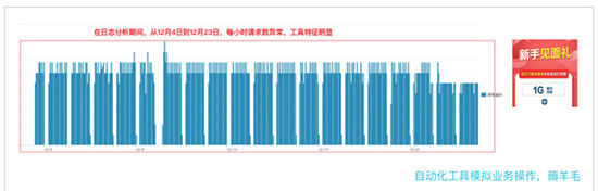 某企业在促销期间,APP异常下载请求总数超过42.9万,每小时请求数十分平均,使用工具发起的请求特征明显。