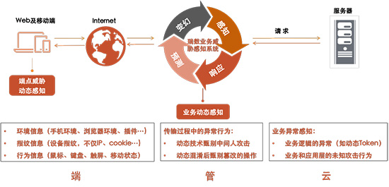瑞数业务感知系统采用了业界领先的动态技术+AI技术,能够为包括Web应用、移动应用和API应用在内的各种应用场景提供业务威胁感知服务。通过智能、高效、主动、端到端的感知机制,结合智能分析算法和技术,通过自学习机制对新型攻击进行发现,让威胁的预测成为可能。