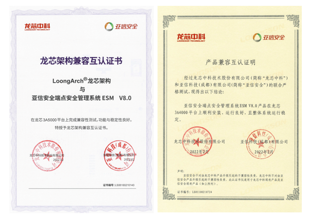 【亚信安全】-【2022年3月2日】近日,亚信安全与龙芯中科技术股份有限公司(简称“龙芯中科”)联合测试并共同发布,亚信安全信端-端点安全管理系统ESM与龙芯CPU成功适配,可以在龙芯3A5000、3A4000处理器平台上稳定运行,相互兼容,可为政企用户提供安全可靠的终端环境。在此基础上,亚信安全与龙芯携手打造的国产终端一体化防护联合解决方案正式发布。