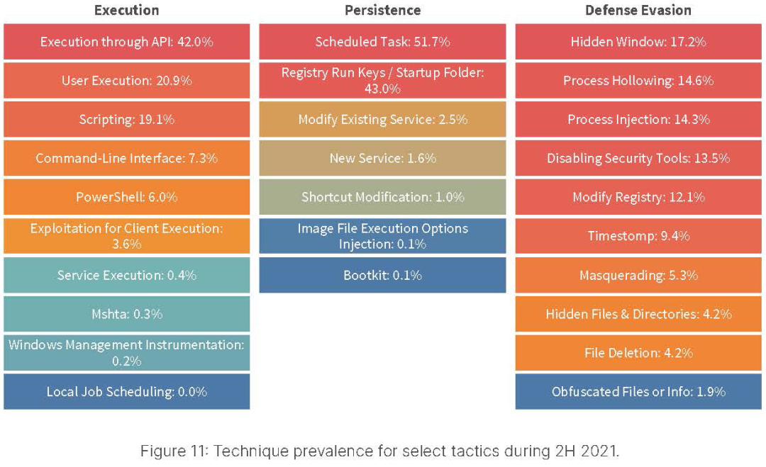 这种高精度的威胁情报明确表明,及早部署阻击攻击者的防范策略是全球企业组织的当务之急,有时通过重点专注于少数已识别的战术,部署相应的安全防护措施,即可事半功倍,有效阻断恶意软件攻击。如下图所示,“攻击执行”阶段一栏中的前三种技术占整个活动的82%。而“攻击持续”阶段一栏中的前两种技术则代表了近95%已观察到的功能。利用此分析结果可以帮助企业组织确定其安全策略部署的优先级,以最大限度发挥安全防护措施产生的积极影响。