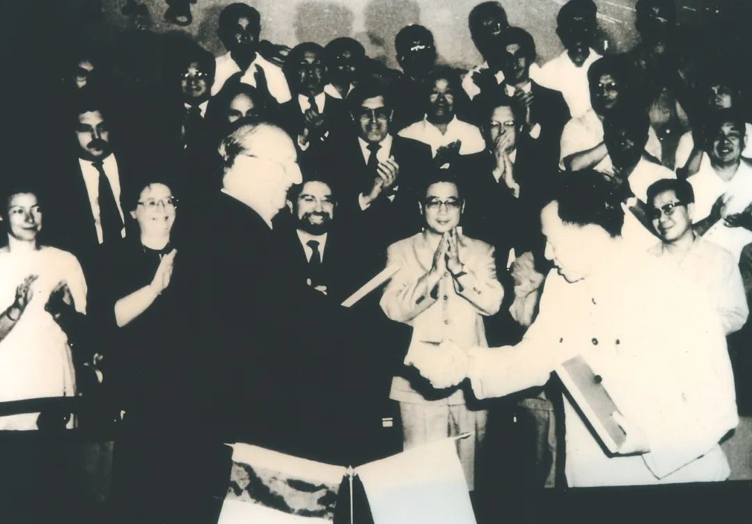 1983年,上海贝尔电话设备制造有限公司合营合同签字仪式在北京人民大会堂举行