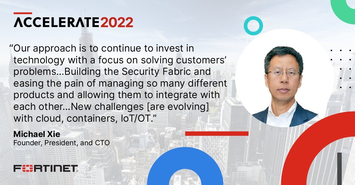 Fortinet创始人,总裁兼首席技术官谢华 (Michael Xie)表示, “持续投入技术领域,专注解决客户问题,是Fortinet发展的基石。通过构建Security Fabric,基于原生集成极大减轻管理众多‘单点’产品的‘痛点’。同时云、容器、 loT / OT 领域的发展带来网络安全新挑战”。