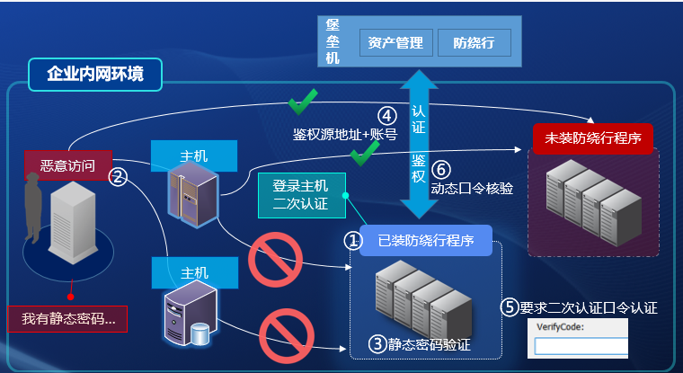 新上线主机在未加固之前,普遍存在弱密码、恶意访问等行为,同时大量的后台访问、跳转访问行导致整个运维过程无法管控与审计,带来安全隐患。亚信安全信磐堡垒机的主机防绕行场景可以通过资产扫描,发现内部未纳管资产,通过一键下发防绕行Agent,将资产的登录进行管控,对未授权登录、异常IP访问进行拦截告警,对敏感资产的访问进行二次认证,解决了因直连和内部跳转等导致的安全隐患。