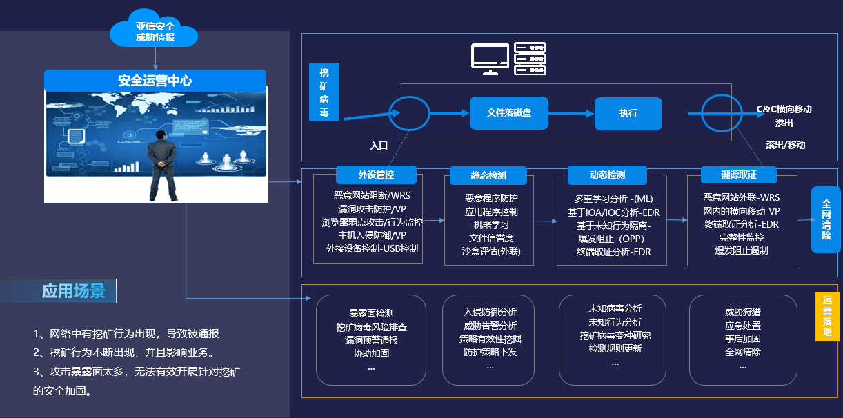 挖矿软件治理场景——以亚信安全XDR解决方案为基础,提供了挖矿失陷治理能力,通过针对黑产挖矿攻击链提供了全面覆盖“云管端关”的一体化防护技术,为贯彻落实虚拟货币“挖矿”整治工作提供了全面支撑。