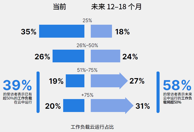 数据显示,当前企业组织工作负载迁移至云端的速度有增无减 。39% 的受访者表示已将超半数工作负载迁移至云端,与此同时,58% 的组织计划在未来 12‒18 个月内达成该目标。