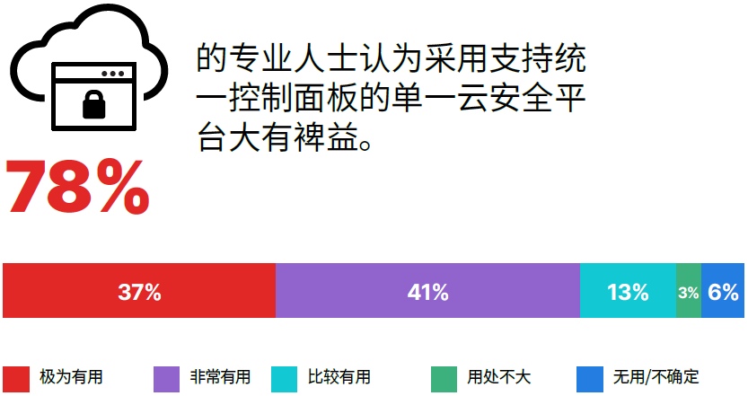 78%的专业人士认为采用支持统一控制面板的单一云安全平台大有裨益。企业还要确保该平台支持跨多个云环境的云原生集成,支持可操作的优先级洞见,简化云安全运营。最理想的状态是,该云原生平台还支持集成广泛的安全解决方案,实现快速响应。