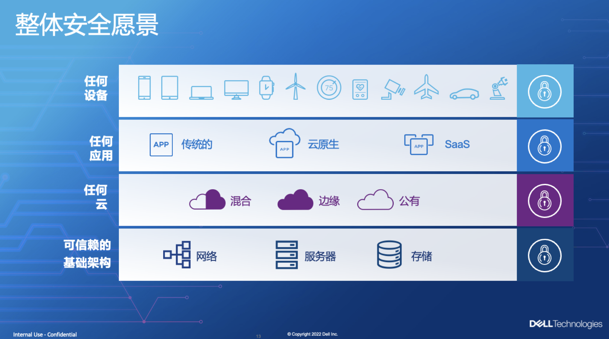 戴尔基于这种优势提出了整体安全愿景,覆盖基础架构、云、应用到设备四个层次。