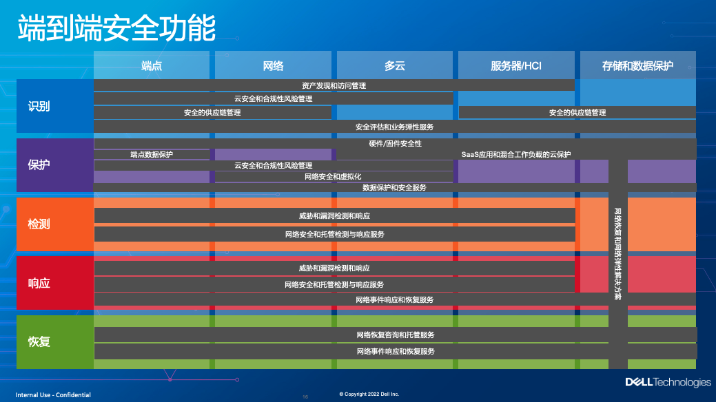 对应的五个关键支柱里,戴尔在端点、网络、多云、服务器/HCI、存储和数据保护五大类产品方案中都埋布了安全控制点。