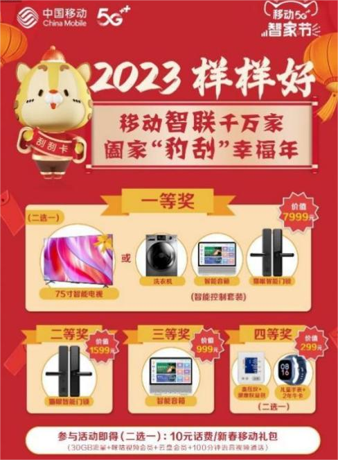 据云南移动相关负责人介绍,用户只要参与本次“移动5G智家节&刮刮卡”活动,便可立即获得10元红包或者新春移动礼包(包含30GB流量、咪咕视频会员、云盘会员、100分钟语音视频通话),还有机会刮出四等大奖,内含智能门锁、家庭智慧安防、智能音箱等各类“智家”好物,不仅在价格上有超大力度优惠,还附带了诸如通用流量、会员权益、专属服务等实惠福利。
