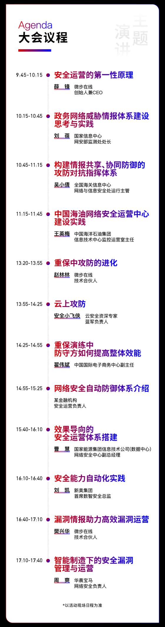 本次大会以“新威胁 新安全”为主题,将邀请权威专家学者以及来自金融、能源、制造、互联网等热门行业安全负责人现身说法,在新威胁与新安全的攻防博弈中,共探面向实战化的安全建设和运营之道。