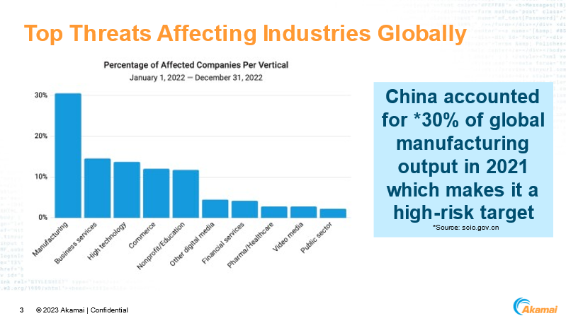 Akamai“全球网络安全分析”表明,2022年,全球最受影响的垂直行业,即企业内部设备最常受到网络攻击的垂直行业就是制造行业。制造行业所受的攻击数量占到总体受到影响企业的三分之一左右,并且远远领先于排名第二的商业服务行业。由于亚太地区已经占到了全球制造行业产出的50%以上,这也反映出亚太地区已经成为深受网络安全困扰的地区。如果再进一步观察,中国占到了全球制造产出的30%,这就使得中国也变相成为了黑客攻击的最大目标之一。