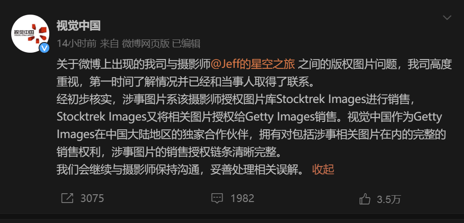 之后视觉中国在微博回应称涉事图片系该摄影师授权图片库Stocktrek Images进行销售,Stocktrek Images又将相关图片授权给Getty Images销售。视觉中国作为Getty Images在中国大陆地区的独家合作伙伴,拥有对包括涉事相关图片在内的完整的销售权利。这一回应似乎暂时解释清楚了事件的来龙去脉,到这个时候大家都以为事情大概到此为止了,但是。。。。他不出意外的就要出意外了。