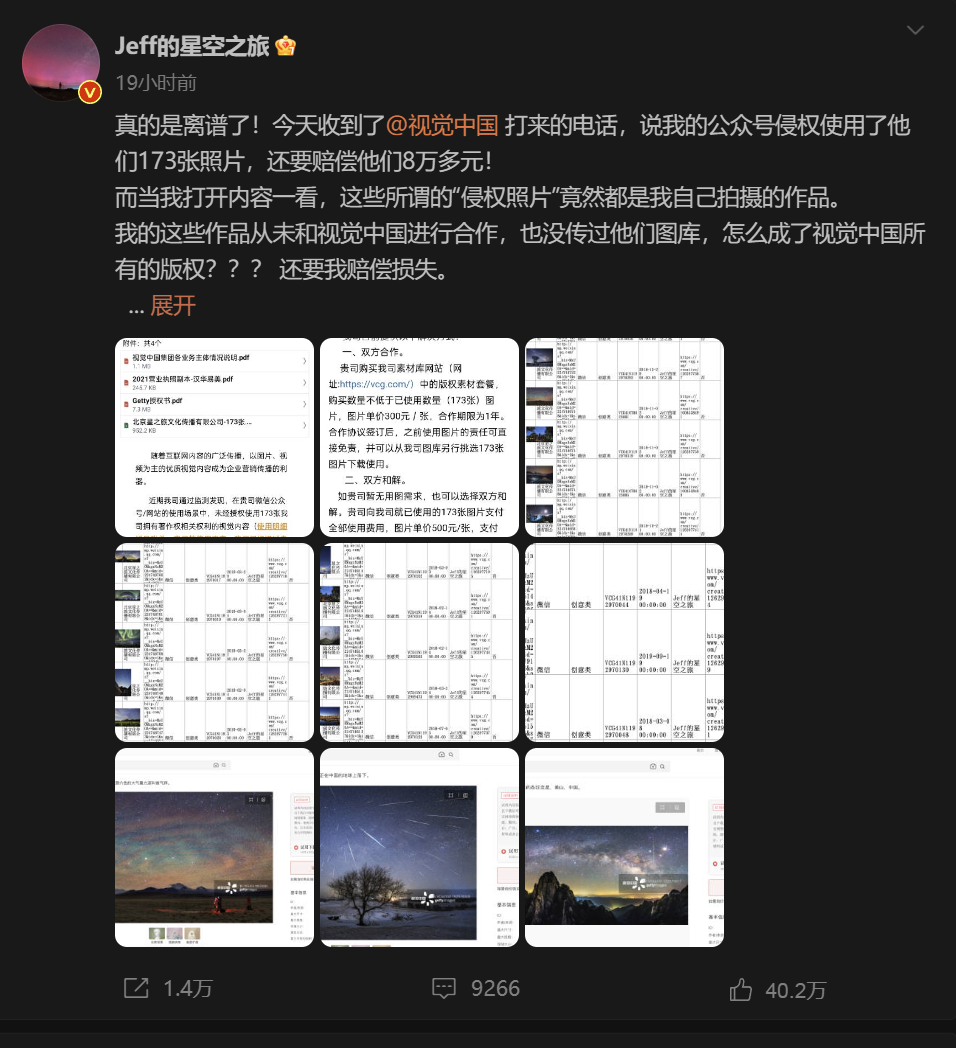 昨天星空摄影师戴建峰(@Jeff 的星空之旅)在微博发言发文称视觉中国打电话说戴建峰自己侵权了自己的作品,将这个曾经将国旗国徽加入过自己版权库的视觉中国在两年之后再次进入了大众的视线,并回忆起了被视觉中国寄律师函的恐惧。