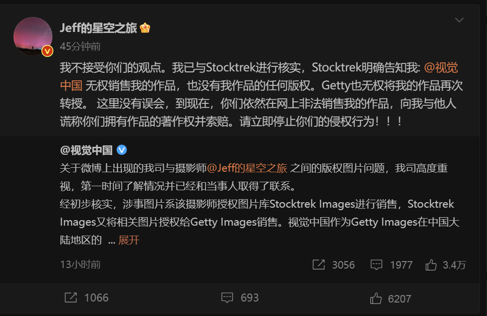 但就在过了一夜之后,中小企业IT网注意到,星空摄影师戴建峰(@Jeff 的星空之旅)宣布视觉中国在撒谎,根据其说法,Stocktrek明确告知戴建峰: @视觉中国 无权销售其作品,也没有作品的任何版权。Getty也无权将作品再次转授。 没有误会,到现在,视觉中国依然在网上非法销售其作品。