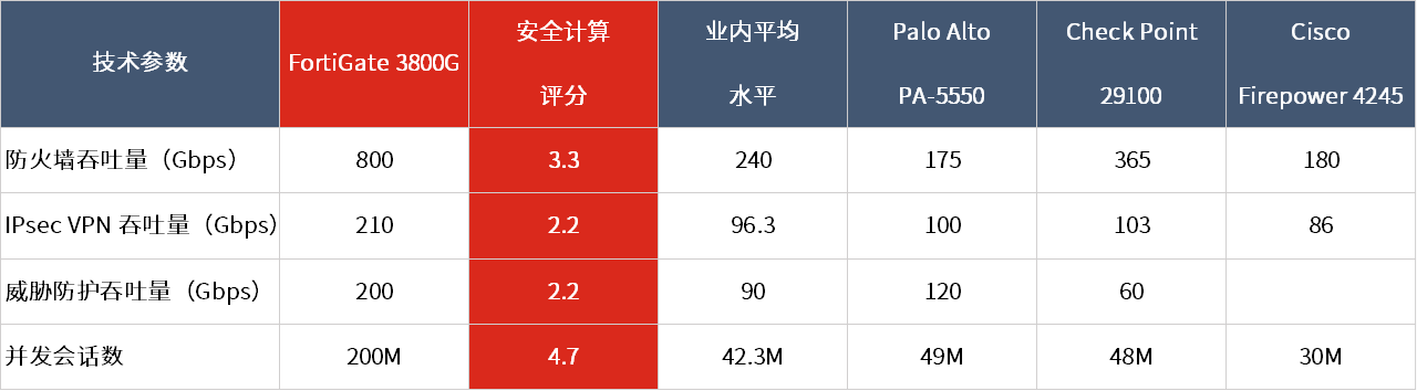 下列安全计算评分表,将市场顶级防火墙与 FortiGate 3800G 目标性能数据进行了比较,凸显了全新 FortiGate 3800G 系列和 FortiGuard 人工智能安全服务的强大优势。