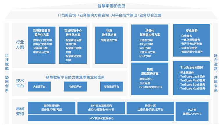 针对这些痛点,联想依托自身数字化转型的实践经验,以及布局全国的服务体系,推出了零售行业解决方案。方案体系不仅涵盖了基础架构产品、基础架构方案、通用技术平台方案、专业服务等全生命周期板块,更面向品牌连锁零售和百货商场/购物中心两大类企业,发布了数字化门店方案、数字化营销方案、全渠道OMO、电商平台方案、智慧商场运营管理方案、智慧商户赋能方案、智慧商场营销方案和智慧物流方案等八大场景化解决方案,以帮助零售企业快速落地,提升业务数字化能力。