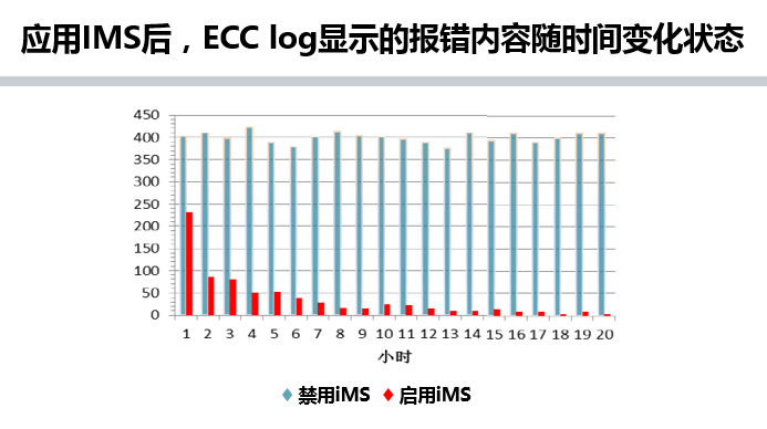 如下图所示,在使用IMS后,ECC log报错日志内容随时间推移成收敛状态,效果显著,每小时ECC报错数从400次逐步减少到不足10次。数据表明,IMS可以有效减少内存错误的发生,提高内存可用性。
