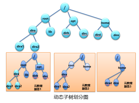 第三种,动态子树分区。大体结构类似上面两种方式,但它可以通过实时监控和分析,把热度数据单位动态地调整到不同的元数据服务节点,从而实现数据索引的动态负载均衡。