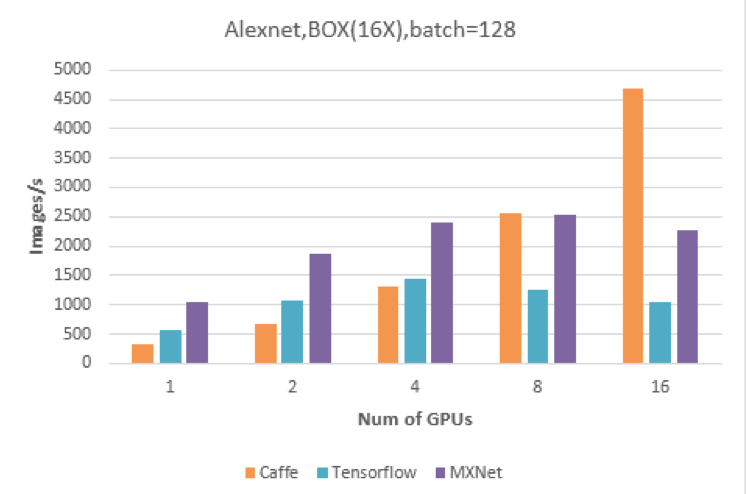 · 从测试结果来看,当运行AlexNet网络时,Caffe性能最好,每秒可以训练图片张数达到4675张,16个GPU比单个GPU的加速比达到14倍。其次是MXNet,最后是TensorFlow。