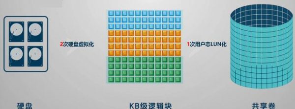 InRAID的“2次硬盘逻辑化+1次用户态虚拟化”管理模式中2次硬盘逻辑化包括,一次硬盘RAID化:对于系统内部物理硬盘,按介质的性能不同分配不同的Disk&LUN,包括SAS SSD、RI SSD(读取密集型SSD)、SAS HDD、SAS NearLine HDD(SAS协议的近线磁盘)四类存储存储介质,将系统内部每种不同类型的存储介质按一定数量划分为逻辑上的RAID;以及一次KB级逻辑块:将不同硬盘上按RAID组成Mdisk,再将Mdisk切分成16MB-8GB,默认1GB(大小可配置)的更细粒度逻辑块(Extent)。1次用户态虚拟化是指,完成一次面向用户态的共享卷构建,按需将1-N个更细粒度逻辑块(Extent)组成卷(Volume)/文件(File)。因此,InRAID相比传统RAID,能够实现重构效率提升10倍、扩容能力提升5倍以及闪存性能提升40%。