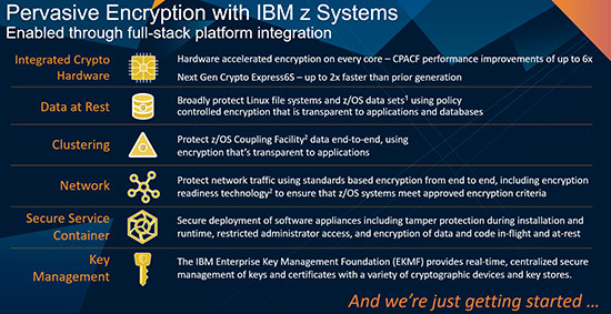 · 硬件上,加密协处理器CPACF跟上一代相比,性能提升高达6倍, 意味着加密解密速度更快。加密卡Crypto Express 6s性能进一步提升,并支持更多的加密算法,降低了加密运算对系统资源的消耗。更为神奇的是,如果使用Crypto Express 加密卡,连管理员也无法知道密钥的明文。如果有人想强行拆除加密卡,读取其中的内容,那么加密卡会启动自曝程序(清零)跟剽窃者同归于尽。
