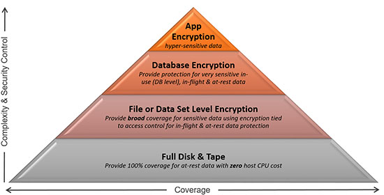 在z系列主机和LinuxONE系列服务器中,安全理念贯穿设计的始终,是典型的build-in思想。在数据生命周期的各个阶段,以及数据存在的不同层次都有充分的安全性考虑,具有前瞻性。例如,对落盘数据可以进行全盘加密;对存放敏感数据的文件或Dataset,可以进行有选择的加密;可以对数据库中的某些数据表进行加密;也可以在应用级别对敏感数据进行加密;在下图的金字塔中,越往上,对数据保护的力度越高,颗粒度也越精细,但是对数据的覆盖面也越小。不管用户对数据保护的需求存在于哪个层次,普遍加密都可以满足。