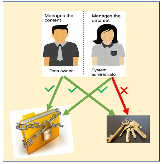 举个例子,在主机最新版本的操作系统之上有这样一个功能:当某个加密文件(data set)的所有者需要访问该文件的内容时,因为他拥有该文件内容和文件密钥的访问权限,所以可以读取或修改文件。而对于系统管理员来说,可以对该文件进行复制,备份或迁移。但是数据管理员不能随便查看该加密文件的内容,因此不享有该文件密钥的访问权限。这样一来,系统管理员既能对数据进行日常管理,又不至于权限过大去访问不该访问的东西。把权力关进制度的笼子里,进一步减少了数据泄露的风险。