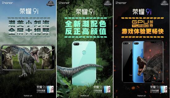 2018年6月15日,适逢电影侏罗纪世界2上映,荣耀手机官微发布了一条荣耀9i与侏罗纪世界2合作海报的微博,从海报可以看出,荣耀9i的潮美刘海屏设计,可让拥有观影游戏都全屏大视野;此外,荣耀9i还有镜面2.0设计和GPU Turbo技术加持、游戏体验更畅快等亮点。