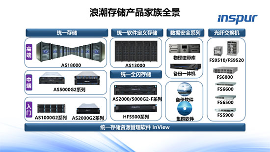 浪潮存储起步于2001年,从2005年起即开始自有品牌存储产品销售,目前主要产品组合包括统一存储、统一软件定义存储、统一全闪存储、数据安全产品、光纤交换机以及存储资源管理软件。“我们最终给客户的不再只是独立的一个个产品,而是产品组合,此外还有客户最在乎的场景实践以及一系列工具。”孙斌表示。