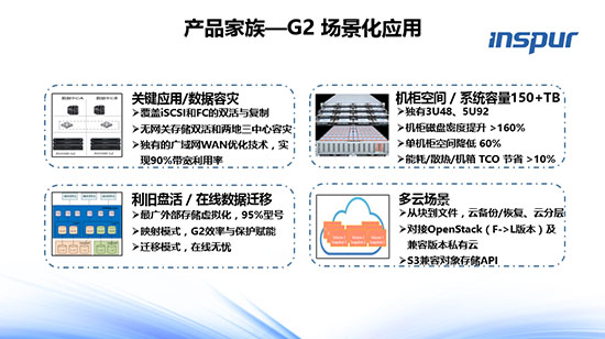 首先,智能存储G2。G2面向的是关键应用,尤其是用户需要数据容灾的需求。浪潮数据容灾双活方案是不需要网关的,并且支持两地三中心。在异地复制上,G2具有独家的WAN传输优化技术,异地复制传输距离达到上百公里,网络包的延迟仅仅几个毫秒。此外,机柜内磁盘密度可以提升160%,单机柜空间可降低60%,这对于提升寸土寸金的数据中心空间利用率具有极大意义。
