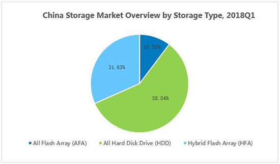 【IDC 2018第一季度中国存储市场闪存存储(AFA和HFA)和HDD存储占比】