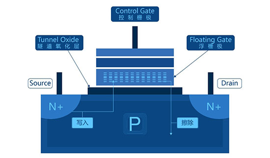 而对浮栅极的充放电,是利用量子隧道效应实现的。当我们要对FLASH进行写入操作的时候,在控制栅极上加高电压,源极和漏极接地,使电子穿越隧道氧化层到达浮栅极,并聚集在浮栅上保持,形成电压,用来存储信息。进行擦除时仍利用隧道效应,把电压反过来加,从而消除浮栅上的电子,达到清除信息的结果。