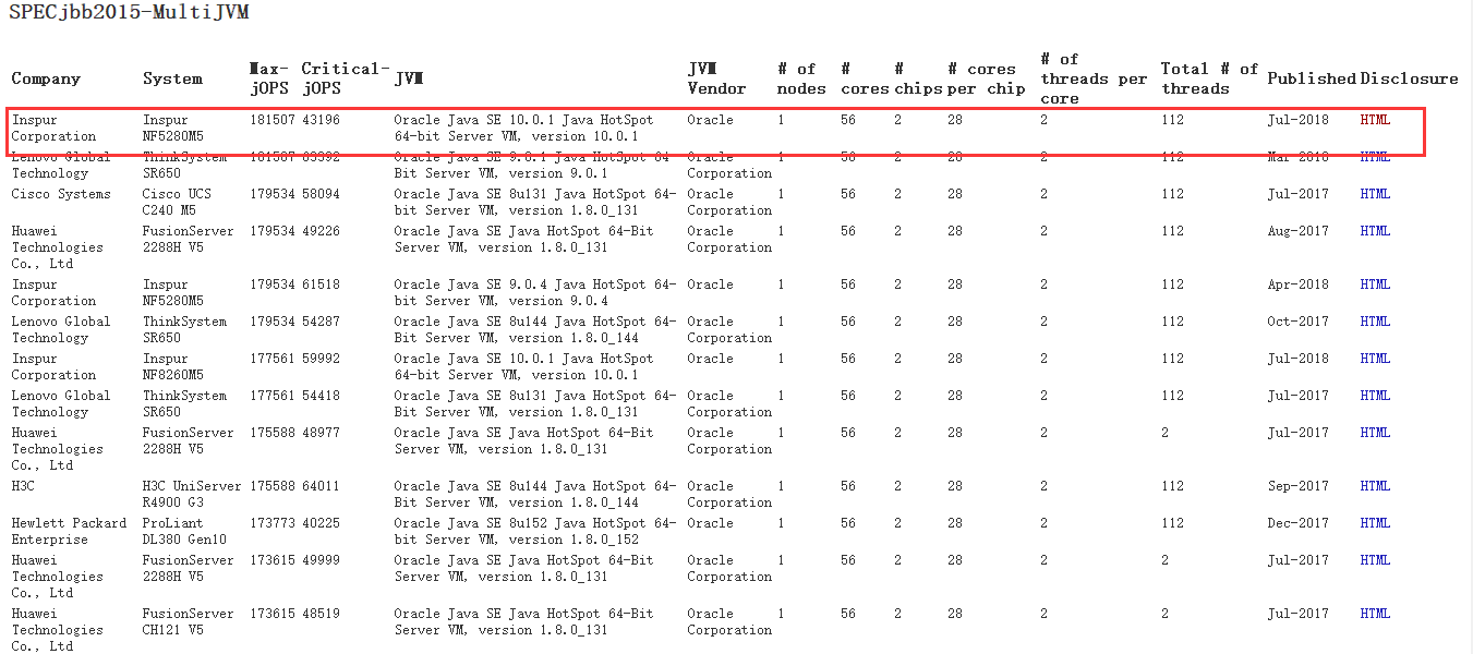日前,SPEC官网公布了最新的jbb2015测试成绩榜单,浪潮双路服务器NF5280M5以每秒完成181507次Java事务处理刷新该项测试中的最高成绩。