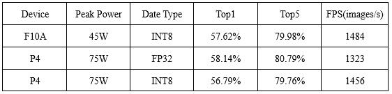 在浪潮F10A FPGA卡上采用SqueezeNet模型对TF2计算加速引擎进行的测试表现出了非常好的计算性能。F10A是全球首款支持Arria 10芯片的半高半长的 FPGA加速卡。SqueezeNet是一种典型的卷积神经网络架构,模型精简但其精度和AlexNet不相上下,特别适合于实时性要求较高的图像类AI应用场景。在F10A上运行经过TF2引擎优化加速的SqueezeNet模型,在基本保持原始精度的情况下,单张图片的计算耗时为0.674ms,在计算精度和延迟方面均略优于目前广泛使用的GPU加速卡P4。
