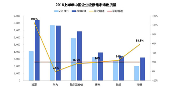 此前,浪潮存储也已成为中国市场的领跑者,出货量、增速均列中国市场第一位。根据IDC公布的2018年上半年《中国企业级存储系统市场调查数据报告》,2018年上半年,浪潮存储出货量8,414套,居中国企业级存储(不含监控)市场第一;出货量增速106%,5倍于业界平均增速,居中国第一。