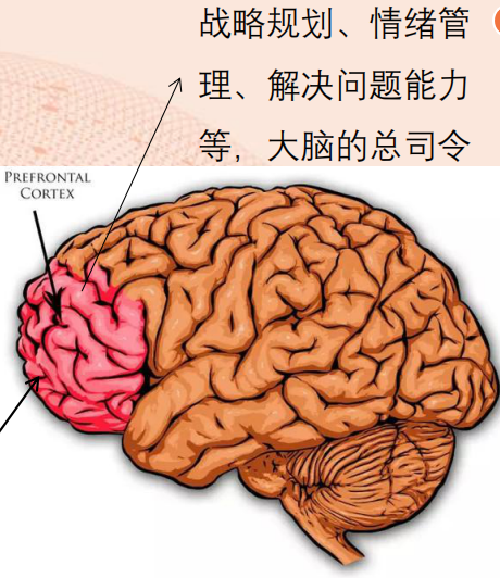 在这里要给大家分享一下大脑的科学知识,在我们大脑前额这一部分,有指甲盖大小的一部分区域叫作前额叶皮质,它掌管着我们的战略规划、时间管理、情绪管控、解决问题的能力。我们称他为大脑的总司令,它统筹全局,做出决策。