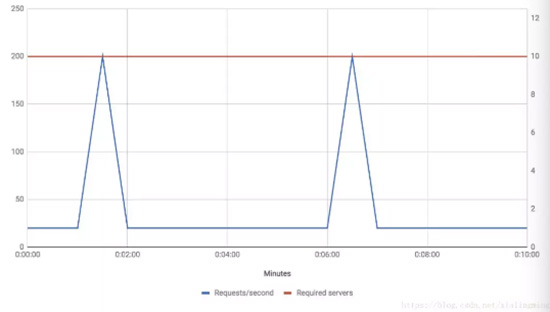 在传统环境中,你可能需要将总硬件数量增加10倍,仅仅为了处理峰值的情况,即使峰值的总持续时间不到总机器正常运行时间的4%。 自动扩展可能不是一个好的选择,因为新的实例启动时,服务器需要多长时间才能启动,峰值阶段将结束。